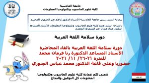 برعاية السيد رئيس جامعة القادسية الأستاذ الدكتور كاظم جبر الجبوري المحترم وبأشراف عميد كلية علوم الحاسوب وتكنولوجيا المعلومات الأستاذ المساعد الدكتور ضياء عيدان جبر الشمري المحترم تقيم وحدة التعليم المستمر دورة علمية حضورية بعنوان ( سلامة اللغه العربية ) وعلى قاعة الدكتور محمد عباس الجبوري في الكلية يحاضر فيها أ.م.د رنا فرمان محمد