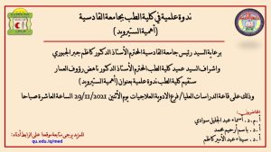 برعاية السيد رئيس جامعة القادسية المحترم الأستاذ الدكتور كاظم جبر الجبوري واشراف السيد عميد كلية الطب المحترم الأستاذ الدكتور ناهض رؤوف العمار ستقيم كلية الطب ندوة علمية بعنوان (أهمية الستيرويد) يحاضر فيها (أ.م.د. أسماء عبد الجليل سوادي ، أ.د. باسم أرحيم محمد ، أ.د. سيناء عبد الأمير كاظم) وذلك على قاعة الدراسات العليا/ فرع الادوية العلاجيات يوم الأثنين 29/11/2021 الساعة العاشرة صباحا