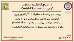 برعاية السيد رئيس جامعة القادسية المحترم الأستاذ الدكتور كاظم جبر الجبوري واشراف السيد عميد كلية الطب المحترم الأستاذ الدكتور ناهض رؤوف العمار ستقيم كلية الطب ندوة علمية بعنوان (كل ماتريد معرفته عن لقاحات Covid-19) يحاضر فيها (أ.د. هادي جبر سهيل) وذلك على قاعة ابن البيطار للمؤتمرات يوم الأربعاء 1/12/2021 الساعة العاشرة صباحا