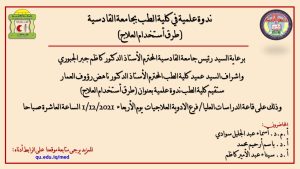 برعاية السيد رئيس جامعة القادسية المحترم الأستاذ الدكتور كاظم جبر الجبوري واشراف السيد عميد كلية الطب المحترم الأستاذ الدكتور ناهض رؤوف العمار ستقيم كلية الطب ندوة علمية بعنوان (طرق أستخدام العلاج) يحاضر فيها (أ.م.د. أسماء عبد الجليل سوادي ، أ.د. باسم أرحيم محمد ، أ.د. سيناء عبد الأمير كاظم) وذلك على قاعة الدراسات العليا/ فرع الادوية العلاجيات يوم الأربعاء 1/12/2021 الساعة العاشرة صباحا