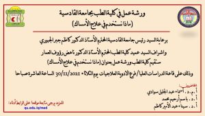 برعاية السيد رئيس جامعة القادسية المحترم الأستاذ الدكتور كاظم جبر الجبوري واشراف السيد عميد كلية الطب المحترم الأستاذ الدكتور ناهض رؤوف العمار ستقيم كلية الطب ورشة عمل بعنوان (ماذا نستخدم في علاج الأمساك) يحاضر فيها (أ.م.د. أسماء عبد الجليل سوادي ، أ.د. باسم أرحيم محمد ، أ.د. سيناء عبد الأمير كاظم) وذلك على قاعة الدراسات العليا/ فرع الادوية العلاجيات يوم الثلاثاء 30/11/2021 الساعة العاشرة صباحا