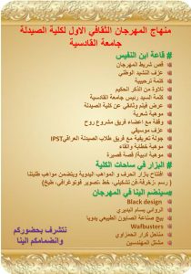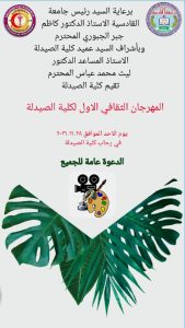 برعاية السيد رئيس جامعة القادسية الاستاذ الدكتور كاظم جبر الجبوري المحترم وبأشراف السيد عميد كلية الصيدلة الاستاذ المساعد الدكتور ليث محمد عباس المحترم تقيم كلية الصيدلة في جامعة القادسية المهرجان الثقافي الاول من نوعه في رحاب كلية الصيدلة