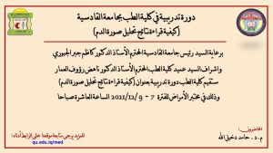 برعاية السيد رئيس جامعة القادسية المحترم الأستاذ الدكتور كاظم جبر الجبوري واشراف السيد عميد كلية الطب المحترم الأستاذ الدكتور ناهض رؤوف العمار ستقيم كلية الطب دورة تدريبية بعنوان (كيفية قراءة نتائج تحليل صورة الدم) يحاضر فيها (م.د. حامد دخيل الله) وذلك في مختبر الأمراض للفترة 7 -9 /12/2021 الساعة العاشرة صباحا.