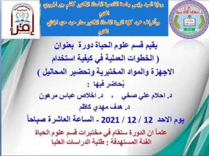 برعايه السيد رئيس جامعه القادسيه الاستاذ الدكتور كاظم جبر الجبوري المحترم وباشراف السيد عميد كليه التربيه الاستاذ الدكتور ستارحميد حمزه الجنابي المحترم يقيم قسم علوم الحياة دورة تدريبيه عنوانها (الاجهزه والمواد المختبرية وتحضير المحاليل ) يحاضر فيها أ. م. د. أحلام علي صخي و أ. م. د. اخلاص عباس مرهون و أ. م. د. هدف مهدي في مختبر البحوث في قسم علوم الحياة الساعه العاشرة صباحاً يوم الأحد الموافق 12/12/ 2021 والدعوه عامه
