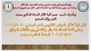 برعاية السيد رئيس جامعة القادسية الاستاذ الدكتور كاظم جبر الجبوري المحترم. وبأشراف السيد عميد كلية الآثار الاستاذ الدكتور محمد كامل روكان المحترم.ستقيم كلية الآثار المؤتمر التقويمي للعام الدراسي ٢٠٢١/٢٠٢٠ وعلى قاعة الاستاذ طه باقر وذلك في يوم الثلاثاء الموافق ٢٠٢١/١٢/١٤ الساعة العاشرة صباحا.