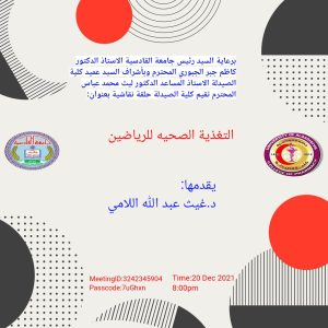 برعاية السيد رئيس جامعة القادسية الاستاذ الدكتور كاظم جبر الجبوري المحترم وبأشراف السيد عميد كلية الصيدلة الاستاذ المساعد الدكتور ليث محمد عباس المحترم تقيم كلية الصيدلة حلقة نقاشية بعنوان:التغذية الصحية للرياضيين