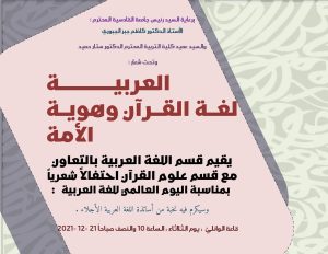 برعاية السيد رئيس جامعة القادسية المحترم الأستاذ الدكتور كاظم جبر الجبوري وبإشراف السيد عميد كلية التربية المحترم الأستاذ الدكتور ستار حميد حمزة الجنابي وبمناسبة اليوم العالمي للغة العربية وتحت شعار ((العربية لغة القرآن وهوية الأمة )) يقيم قسم اللغة العربية وبالتعاون مع قسم علوم القران احتفالا بالمناسبة يوم الثلاثاء ٢٠٢١/١٢/٢١ الساعة العاشرة صباحا في قاعة الوائلي والدعوة عامة …