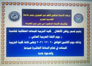 اليوم العالمي للغة العربية هو يوم للاحتفال باللغة العربية ويصادف 18 كانون الأول، يدعوكم قسم رياض الاطفال في كليتنا للانظام في المهرجان الثقافي للغة الضاد بهذه المناسبة يوم غد ان شاء الله الاثنين 20 / 12 / 2021