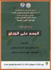 برعاية رئيس جامعة القادسية الاستاذ الدكتور كاظم جبر الجبوري المحترم واشراف السيد عميد كلية الفنون الجميلة الاستاذ الدكتور كاظم نوير الزبيدي المحترم تقدم كلية الفنون الجميلة جامعة القادسية ورشة عمل بعنوان (الرسم على الزجاج ) يقدمها كل من الدكتور محمد شاكر الركابي والدكتور عباس تركي محيسن التدريسيين في كلية الفنون الجميلة جامعة القادسية .