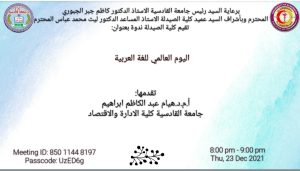 برعاية السيد رئيس جامعة القادسية الاستاذ الدكتور كاظم جبر الجبوري المحترم وبأشراف السيد عميد كلية الصيدلة الاستاذ المساعد الدكتور ليث محمد عباس المحترم تقيم كلية الصيدلة ندوة بعنوان :اليوم العالمي للغة العربية