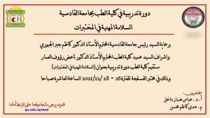 برعاية السيد رئيس جامعة القادسية المحترم الأستاذ الدكتور كاظم جبر الجبوري واشراف السيد عميد كلية الطب المحترم الأستاذ الدكتور ناهض رؤوف العمار ستقيم كلية الطب دورة تدريبية بعنوان (السلامة المهنية في المختبرات) يحاضر فيها (أ.د. عباس صبار داخل ، م. هدى كاظم محسن) وذلك في مختبر الفسلجة للفترة 26 – 28 /12/2021 الساعة العاشرة صباحا