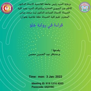 برعاية السيد رئيس جامعة القادسية الاستاذ الدكتور كاظم جبر الجبوري المحترم وبأشراف السيد عميد كلية الصيدلة الاستاذ المساعد الدكتور ليث محمد عباس المحترم تقيم كلية الصيدلة حلقة نقاشية بعنوان :