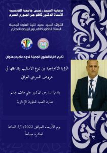 تقيم كلية الفنون الجميلة جامعة القادسية ندوة علمية بعنوان : ( الرؤية الاخراجية بين تنوع الاساليب وتداخلها في عروض المسرح العراقي ) يقدمها المدرس الدكتور حليم هاتف جاسم معاون العميد للشؤون الإدارية يوم غد الأربعاء الموافق 5/1/2022 الساعة العاشرة صباحاً.