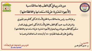برعاية السيد رئيس جامعة القادسية المحترم الأستاذ الدكتور كاظم جبر الجبوري واشراف السيد عميد كلية الطب المحترم الأستاذ الدكتور ناهض رؤوف العمار ستقيم كلية الطب دورة تدريبية بعنوان (الأجهزة المختبرية: طريقة استخدامها والمحافظة عليها) يحاضر فيها (م. هدى كاظم محسن) وذلك في مختبر الفسلجة للفترة 9 – 11/1/2022 الساعة العاشرة صباحا