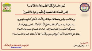 برعاية السيد رئيس جامعة القادسية المحترم الأستاذ الدكتور كاظم جبر الجبوري واشراف السيد عميد كلية الطب المحترم الأستاذ الدكتور ناهض رؤوف العمار ستقيم كلية الطب ندوة علمية بعنوان (دور الساندات العصبية في طب وجراحة العيون) يحاضر فيها (أ.د. فرقان مجيد حميد) وذلك على قاعة نقابة الأطباء/فرع الديوانية يوم الأربعاء 12/1/2022 الساعة التاسعة مساءا