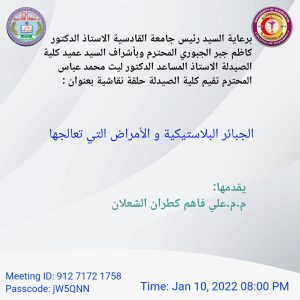 برعاية السيد رئيس جامعة القادسية الاستاذ الدكتور كاظم جبر الجبوري المحترم وبأشراف السيد عميد كلية الصيدلة الاستاذ المساعد الدكتور ليث محمد عباس المحترم تقيم كلية الصيدلة حلقة نقاشية بعنوان : الجبائر البلاستيكية و الأمراض التي تعالجها
