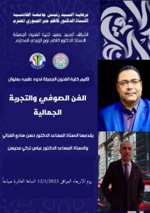 برعاية السيد رئيس جامعة القادسية الاستاذ الدكتور كاظم جبر الجبوري المحترم واشراف السيد عميد كلية الفنون الجميلة الاستاذ الدكتور كاظم نوير الزبيدي المحترم تقيم كلية الفنون الجميلة جامعة القادسية ندوة علمية بعنوان ( الفن الصوفي والتجربة الجمالية ) والتي يقدمها الاستاذ المساعد الدكتور حسن هادي الغزالي والاستاذ المساعد الدكتور عباس تركي محيسن وذلك يوم الأربعاء الموافق 12/1/2022 الساعة العاشرة صباحاً وعلى قاعة الدراسات العليا في قسم التربية الفنية .