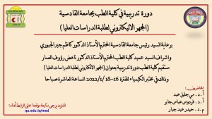برعاية السيد رئيس جامعة القادسية المحترم الأستاذ الدكتور كاظم جبر الجبوري واشراف السيد عميد كلية الطب المحترم الأستاذ الدكتور ناهض رؤوف العمار ستقيم كلية الطب دورة تدريبية بعنوان (المجهر الالكتروني لطلبة الدراسات العليا) يحاضر فيها (أ.د. مي جليل عبد ، أ.د. فردوس عباس جابر ، م.د. حيدر عبد جبار) وذلك في مختبر الكيمياء للفترة 16-18 /1/2022 الساعة العاشرة صباحا