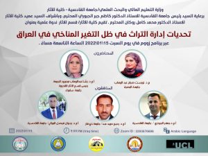 يحاضر فيها كلا من: ا. م. د جعفر حمزة الجوذري _كلية الآثار/جامعة القادسية و ا. م. د. رحيم حميد عبود /جامعة ذي قار. و ا. م. د رجوان فيصل الميالي /كلية الاثار _جامعة القادسية.. و ا. م. د رشا عبد الجبار حمود رئيس قسم الآثار في جامعة سامراء.. و م. د نورست صباح عبد الوهاب /جامعة البصرة … وذلك عبر منصة ( zoom ) في تمام الساعة التاسعة من مساء يوم السبت الموافق١٥/ ١ /٢٠٢٢