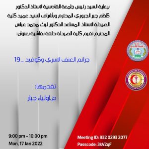 برعاية السيد رئيس جامعة القادسية الاستاذ الدكتور كاظم جبر الجبوري المحترم وبأشراف السيد عميد كلية الصيدلة الاستاذ المساعد الدكتور ليث محمد عباس المحترم تقيم كلية الصيدلة حلقة نقاشية بعنوان : جرائم العنف الاسري وكوفيد _ ١٩