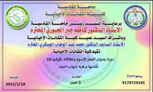 برعاية السيد رئيس جامعة القادسية الأستاذ الدكتور كاظم جبر الجبوري المحترم وبأشراف ومتابعة السيد عميد كلية التقانات الاحيائية الأستاذ المساعد الدكتور محمد عبد الوهاب العسكري ستقيم كلية التقانات الاحيائية دورة بعنوان الفطر الاسود وعلاقته بكوفيد ١٩