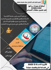 تهدف الندوة الى تمكين السادة التدريسين في كيفية أستخدام برنامج Power point في أنشاء العروض التقديمة وأضافة المؤثرات المختلفة عليها والتحكم بها من خلال أستخدام أدوات وميزات البرنامج .