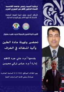 برعاية السيد رئيس جامعة القادسية الاستاذ الدكتور كاظم جبر الجبوري المحترم واشراف السيد عميد كلية الفنون الجميلة الاستاذ الدكتور كاظم نوير الزبيدي المحترم تقيم كلية الفنون الجميلة جامعة القادسية ندوة علمية بعنوان ( تحضير وتهيئة مادة الطين وآلية اشتغاله في الخزف ) والتي يقدمها الاستاذ المساعد الدكتور الدكتور علي جرد كاظم وبأدارة وتقديم الاستاذ المساعد الدكتور عباس تركي محيسن .