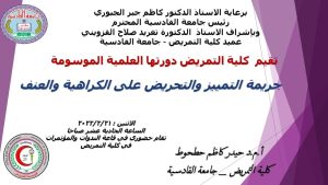 برعاية الاستاذ الدكتور كاظم جبر الجبوري رئيس جامعة القادسية المحترم وباشراف الاستاذ الدكتور تغريد صلاح القزويني عميد كلية التمريض المحترمة .تقيم كلية التمريض دورة تدريبية بعنوان (جريمة التحريض الإلكتروني والاعلامي على الكراهية والعنف) والتي حاضر فيها أ. م. د. حيدر كاظم من كلية التمريض .