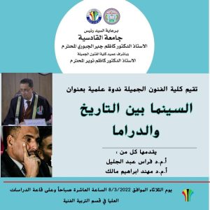 برعاية رئيس جامعة القادسية الاستاذ الدكتور كاظم جبر الجبوري المحترم واشراف السيد عميد كلية الفنون الجميلة الاستاذ الدكتور كاظم نوير الزبيدي المحترم تقيم كلية الفنون الجميلة جامعة القادسية ندوة علمية بعنوان ( السينما بين التاريخ والدراما ) والتي يقدمها أ.م.د فراس عبد الجليل و أ.م.د مهند ابراهيم مالك التدريسيين في كلية الفنون الجميلة جامعة القادسية .