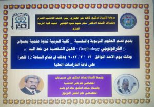 برعايه السيد رئيس جامعة القادسية الاستاذ الدكتور كاظم جبر الجبوري المحترم وباشراف السيد عميد كلية التربية الاستاذ الدكتور ستار حميد حمزه الجنابي المحترم يقيم قسم العلوم التربويه والنفسيه ندوه علميه بعنوان( الكرافولوجي تحليل الشخصيه من خط اليد ) يقدمها الاستاذ المساعد الدكتور علي حسين عايد و الاستاذ المساعد خالد ابو جاسم عبد يوم الاحد الموافق ١٣/ ٣/ ٢٠٢٢ في تمام الساعه الثانيه عشر ظهرا وعلى قاعه الدراسات العليا في القسم والدعوه عامه للجميع