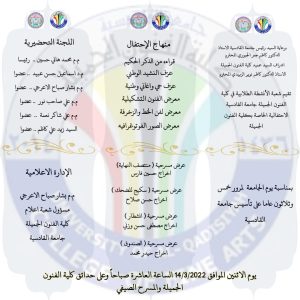 وذلك يوم الاثنين الموافق 14/3/2022 الساعة العاشرة صباحاً على حدائق كلية الفنون الجميلة والمسرح الصيفي .