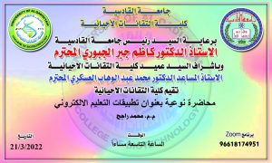برعاية السيد رئيس جامعة القادسية الأستاذ الدكتور كاظم جبر الجبوري المحترم وبأشراف ومتابعة السيد عميد كلية التقانات الاحيائية الأستاذ المساعد الدكتور محمد عبد الوهاب العسكري ستقيم كلية التقانات الاحيائية محاضرة نوعية بعنوان تطبيقات التعليم الالكتروني