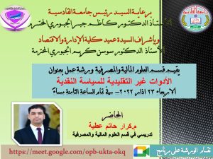 التدريسي في كلية الادارة والاقتصاد / قسم العلوم المالية والمصرفية وذلك عبر تطبيق ( meet ) في الساعة الثامنة من مساء يوم الاربعاء 23 اذار 2022
