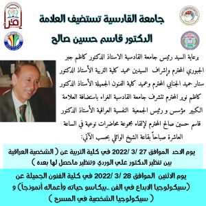 برعاية السيد رئيس جامعة القادسية الاستاذ الدكتور كاظم جبر الجبوري المحترم وإشراف السيدين عميد كلية التربية الأستاذ الدكتور ستار حميد الجنابي المحترم وعميد كلية الفنون الجميلة الأستاذ الدكتور كاظم نوير المحترم تتشرف جامعة القادسية الغراء باستضافة العلامة الكبير مؤسس و رئيس الجمعية النفسية العراقية الأستاذ الدكتور قاسم حسين صالح المحترم