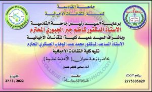 برعاية السيد رئيس جامعة القادسية الأستاذ الدكتور كاظم جبر الجبوري المحترم وبأشراف ومتابعة السيد عميد كلية التقانات الاحيائية الأستاذ المساعد الدكتور محمد عبد الوهاب العسكري ستقيم كلية التقانات الاحيائية محاضرة نوعية الاغذية العضوية