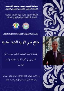 برعاية رئيس جامعة القادسية الاستاذ الدكتور كاظم جبر الجبوري المحترم واشراف السيد عميد كلية الفنون الجميلة الاستاذ الدكتور كاظم نوير الزبيدي المحترم تقيم كلية الفنون الجميلة جامعة القادسية ندوة علمية بعنوان ( مناهج قسم التربية الفنية الحديثة ) والتي يقدمها الاستاذ المساعد الدكتور عباس تركي محيسن التدريسي في كلية الفنون الجميلة جامعة القادسية .