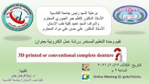 تهدف هذه الورشة للتعريف عن اطقم الأسنان الكاملة المعمولة بتقنية الطباعة ثلاثية الأبعاد وأهم المواد المتوفرة وإمكانية استعمال هذه الأطقم كبديل للأطقم الكاملة المصنعة بالطريقة اليدوية التقليدية.