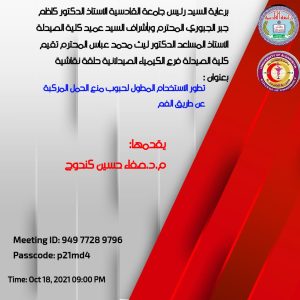 برعاية السيد رئيس جامعة القادسية الاستاذ الدكتور كاظم جبر الجبوري المحترم وبأشراف السيد عميد كلية الصيدلة الاستاذ المساعد الدكتور ليث محمد عباس المحترم ستقيم كلية الصيدلة فرع الكيمياء الصيدلانية حلقة نقاشية بعنوان :