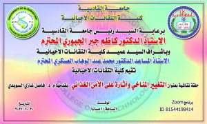 برعاية السيد رئيس جامعة القادسية الأستاذ الدكتور كاظم جبر الجبوري المحترم وبأشراف ومتابعة السيد عميد كلية التقانات الاحيائية الأستاذ المساعد الدكتور محمد عبد الوهاب العسكري ستقيم كلية التقانات الاحيائية ورشة عمل بعنوان التغير المناخي واثارة على الامن الغذائي وذلك بتاريخ ٢٠/١٠/٢٠٢٠ يلقيها م.د فاضل غازي السويدي