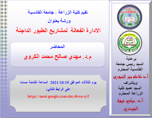 تقيم كلية الزراعة جامعة القادسية ورشة علمية بعنوان 🙁الادارة الفعالة لمشاريع الطيور الداجنة)يحاضر فيها
