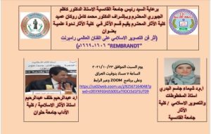 يحاضر فيها الاستاذ الدكتور عبد الرحيم خلف عبد الرحيم استاذ الآثار الإسلامية في كلية الاداب / جامعة حلوان ؛ والأستاذ المساعد الدكتور شيماء جاسم البدري ؛؛ يوم السبت الموافق ٢٣ / ١٠ / ٢٠٢١ في تمام الساعة السابعة مساء ؛ وذلك عبر تطبيق (Zoom) وعبر الرابط أدناه