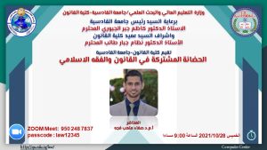 برعاية السيد رئيس جامعة القادسية الاستاذ الدكتور كاظم جبر الجبوري وباشراف السيد عميد كلية القانون الاستاذ الدكتور نظام جبار طالب بعقد القسم الخاص في كلية القانون ورشة العمل الموسومة ( الحضانة المشتركة في القانون والفقه الاسلامي ) في يوم الخميس المقبل والموافق ٢٨-١٠-٢٠٢١ في تمام الساعه التاسعه مساءا على رابط الزووم