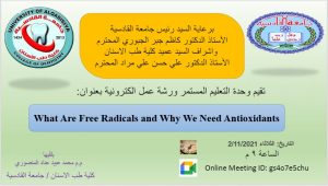 تتضمن الورشه مفاهيم عن الجذور الحرة ومصادرها الداخلية والخارجية وتاثيرها على الخلايا وجسم الانسان ، وتعرف الورشة باليات الدفاع التي تستخدمها الخلية لمجابهة الجذور الحرة المتضمنة بمضادات الاكسدة بانواعها وما هي مضادات الاكسدة من المصادر الخارجية التي يحتاجها الانسان.
