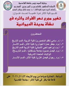 برعاية رئيس جامعة القادسية الاستاذ الدكتور كاظم جبر الجبوري المحترم واشراف السيد عميد كلية الآثار الاستاذ الدكتور محمد كامل روكان المحترم ستقيم كلية الاثار بالتعاون مع كلية التربية في جامعة القادسية وقسم التاريخ في جامعة بنسلفانيا الامريكية ندوة علمية بعنوان (تغير مجرى نهر الفرات واثره في نشأة مدينة الديوانية ) في تمام الساعة العاشرة صباحا من يوم الاربعاء المصادف 3/11/2021 على قاعة طه باقر في كلية الاثار- جامعة القادسية…