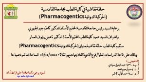 برعاية السيد رئيس جامعة القادسية المحترم الأستاذ الدكتور كاظم جبر الجبوري واشراف السيد عميد كلية الطب المحترم الأستاذ الدكتور ناهض رؤوف العمار ستقيم كلية الطب حلقة نقاشية بعنوان (الحركية الدوائية Pharmacogentics) يحاضر فيها (أ.م.د. أسماء عبد الجليل سوادي ، أ.د. باسم أرحيم محمد ، أ.د. سيناء عبد الأمير كاظم) وذلك على قاعة الدراسات العليا/ فرع الادوية العلاجيات يوم الثلاثاء 16/11/2021 الساعة العاشرة صباحا.