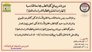 برعاية السيد رئيس جامعة القادسية المحترم الأستاذ الدكتور كاظم جبر الجبوري واشراف السيد عميد كلية الطب المحترم الأستاذ الدكتور ناهض رؤوف العمار ستقيم كلية الطب دورة تدريبية بعنوان (المهارات المختبرية لطلبة الدراسات العليا) يحاضر فيها (أ.د. أنوار جاسب ثعبان ، م.د. حيدر عبد جبار ، م.د. أحمد غضبان ثعبان) وذلك على قاعة مختبر الكيمياء للفترة 2021/11 / 18 – 16 الساعة العاشرة صباحا.