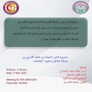 برعاية السيد رئيس جامعة القادسية الاستاذ الدكتور كاظم جبر الجبوري المحترم وبأشراف السيد عميد كلية الصيدلة الاستاذ المساعد الدكتور ليث محمد عباس المحترم تقيم كلية الصيدلة شعبة الانشطة الطلابية حلقة نقاشية بعنوان : مشروع قانون الحماية من العنف الاسري بين مشكلة الواقع وخطورة المعالجات